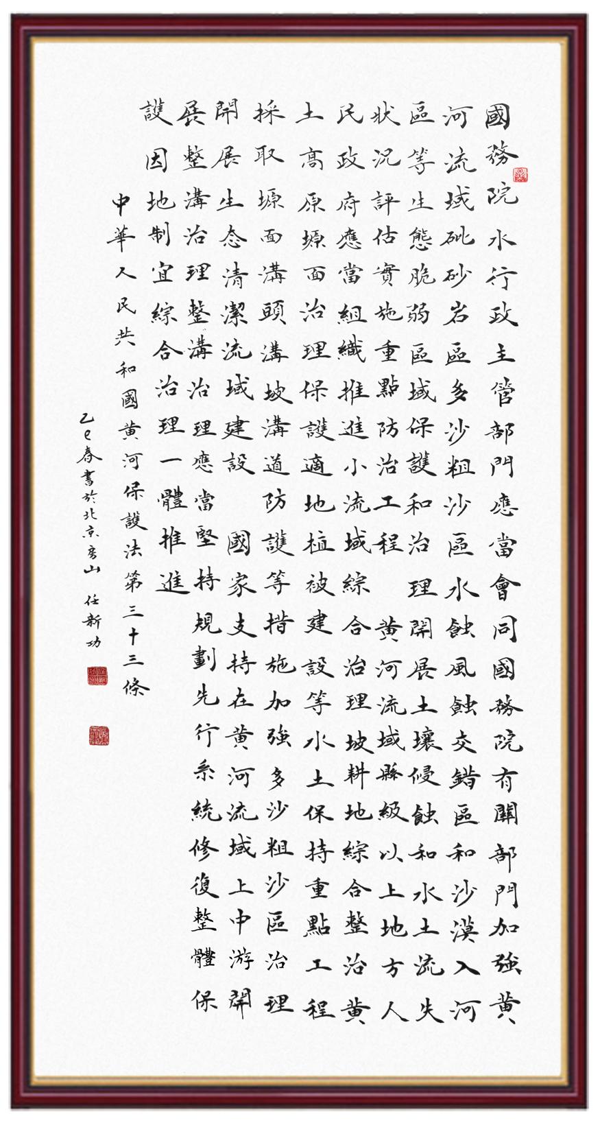 黃河寧,天下平。黃河是中華民族的發(fā)源地和搖籃,保護黃河是事關(guān)中華民族偉大復(fù)興的千秋大計?!吨腥A人民共和國黃河保護法》為推進水資源節(jié)約集約利用、保護傳承弘揚黃河文化、推動黃河流域生態(tài)保護和高質(zhì)量發(fā)展提供了有力法治保障。繼書寫《中華人民共和國民法典》《中華人民共和國憲法》《中華人民共和國澳門特別行政區(qū)基本法》《中華人民共和國香港特別行政區(qū)基本法》《中華人民共和國國旗法》《中華人民共和國國徽法》《中華人民共和國國歌法》《中華人民共和國法官法》等法律法規(guī)之后,法制日報社聯(lián)合沿黃九?。▍^(qū))司法廳、書法家協(xié)會,將筆端對準(zhǔn)《中華人民共和國黃河保護法》。