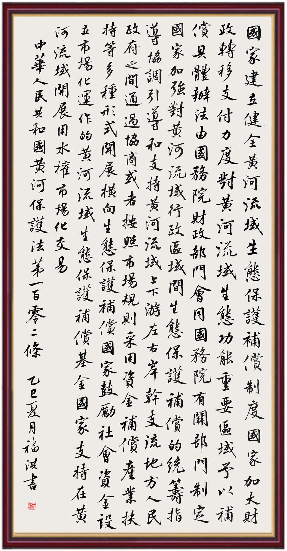 黃河寧,天下平。黃河是中華民族的發(fā)源地和搖籃,保護黃河是事關(guān)中華民族偉大復(fù)興的千秋大計。《中華人民共和國黃河保護法》為推進水資源節(jié)約集約利用、保護傳承弘揚黃河文化、推動黃河流域生態(tài)保護和高質(zhì)量發(fā)展提供了有力法治保障。繼書寫《中華人民共和國民法典》《中華人民共和國憲法》《中華人民共和國澳門特別行政區(qū)基本法》《中華人民共和國香港特別行政區(qū)基本法》《中華人民共和國國旗法》《中華人民共和國國徽法》《中華人民共和國國歌法》《中華人民共和國法官法》等法律法規(guī)之后,法制日報社聯(lián)合沿黃九?。▍^(qū))司法廳、書法家協(xié)會,將筆端對準(zhǔn)《中華人民共和國黃河保護法》。