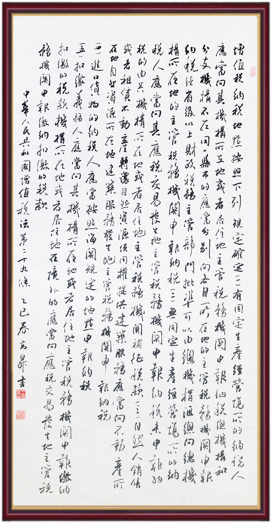 稅收一頭連著國計,一頭連著民生。全面推進依法治稅,是全面依法治國基本方略在稅收領域的集中體現(xiàn)。《中華人民共和國增值稅法》將于2026年1月1日起施行,對全面落實稅收法定原則、健全有利于高質(zhì)量發(fā)展的增值稅制度、規(guī)范增值稅的征收和繳納、保護納稅人合法權益具有重要意義。繼書寫《中華人民共和國民法典》《中華人民共和國憲法》《中華人民共和國國旗法》《中華人民共和國國徽法》《中華人民共和國國歌法》《中華人民共和國法官法》《中華人民共和國黃河保護法》等法律法規(guī)之后,法制日報社將筆端對準《中華人民共和國增值稅法》。