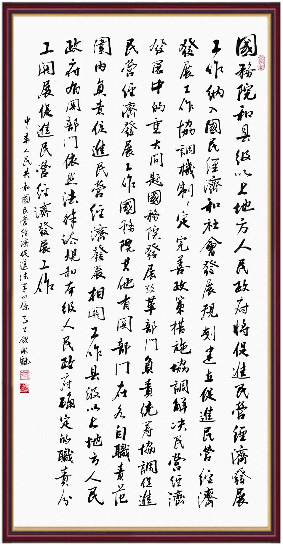《中華人民共和國民營經(jīng)濟促進法》自今年5月20日起施行。作為我國首部專門關于民營經(jīng)濟發(fā)展的基礎性法律,民營經(jīng)濟促進法將支持和保障民營經(jīng)濟發(fā)展的法律制度融入中國特色社會主義法律體系,具有重大的法治意義,為促進民營經(jīng)濟持續(xù)、健康、高質(zhì)量發(fā)展提供了堅實的法治保障。為更好地學習、宣傳、貫徹這部法律,法治日報社聯(lián)合司法部普法與依法治理局,開展“‘書·法’系列活動之書寫《中華人民共和國民營經(jīng)濟促進法》”活動。