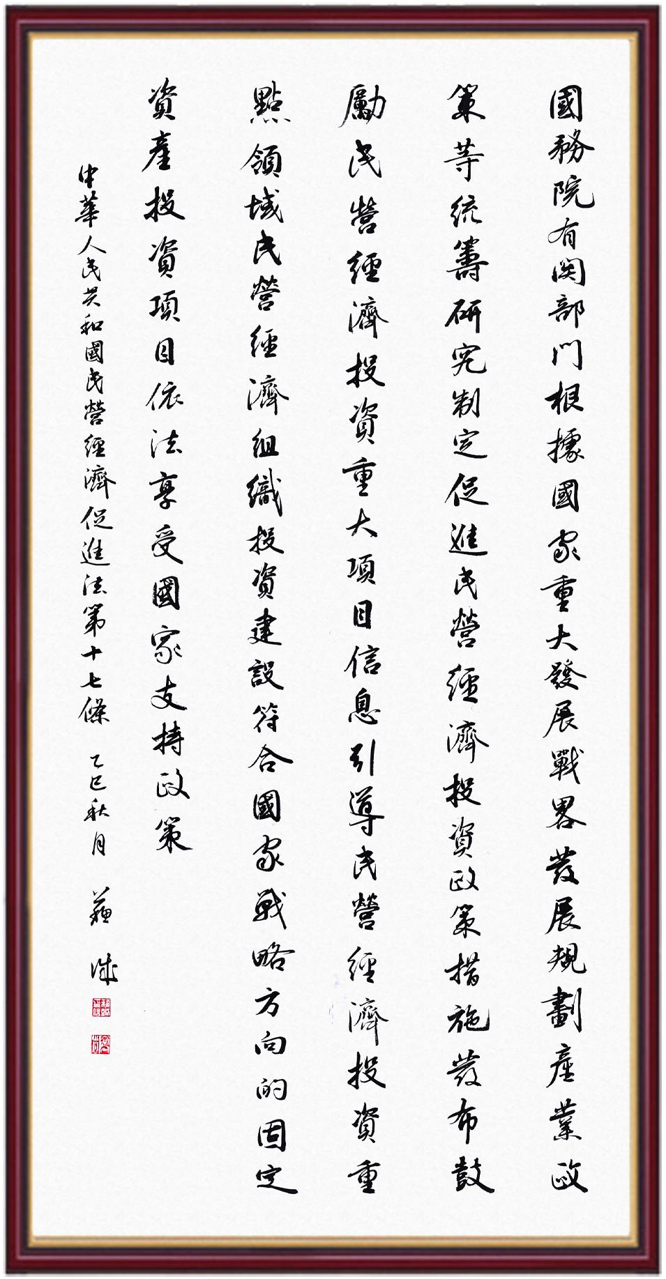 《中華人民共和國民營經(jīng)濟促進法》自今年5月20日起施行。作為我國首部專門關(guān)于民營經(jīng)濟發(fā)展的基礎性法律,民營經(jīng)濟促進法將支持和保障民營經(jīng)濟發(fā)展的法律制度融入中國特色社會主義法律體系,具有重大的法治意義,為促進民營經(jīng)濟持續(xù)、健康、高質(zhì)量發(fā)展提供了堅實的法治保障。為更好地學習、宣傳、貫徹這部法律,法治日報社聯(lián)合司法部普法與依法治理局,開展“‘書·法’系列活動之書寫《中華人民共和國民營經(jīng)濟促進法》”活動。