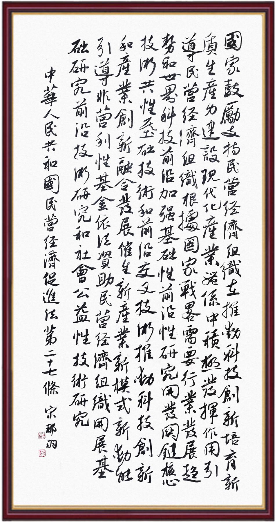 《中華人民共和國民營經(jīng)濟促進法》自今年5月20日起施行。作為我國首部專門關(guān)于民營經(jīng)濟發(fā)展的基礎(chǔ)性法律,民營經(jīng)濟促進法將支持和保障民營經(jīng)濟發(fā)展的法律制度融入中國特色社會主義法律體系,具有重大的法治意義,為促進民營經(jīng)濟持續(xù)、健康、高質(zhì)量發(fā)展提供了堅實的法治保障。為更好地學(xué)習(xí)、宣傳、貫徹這部法律,法治日報社聯(lián)合司法部普法與依法治理局,開展“‘書·法’系列活動之書寫《中華人民共和國民營經(jīng)濟促進法》”活動。