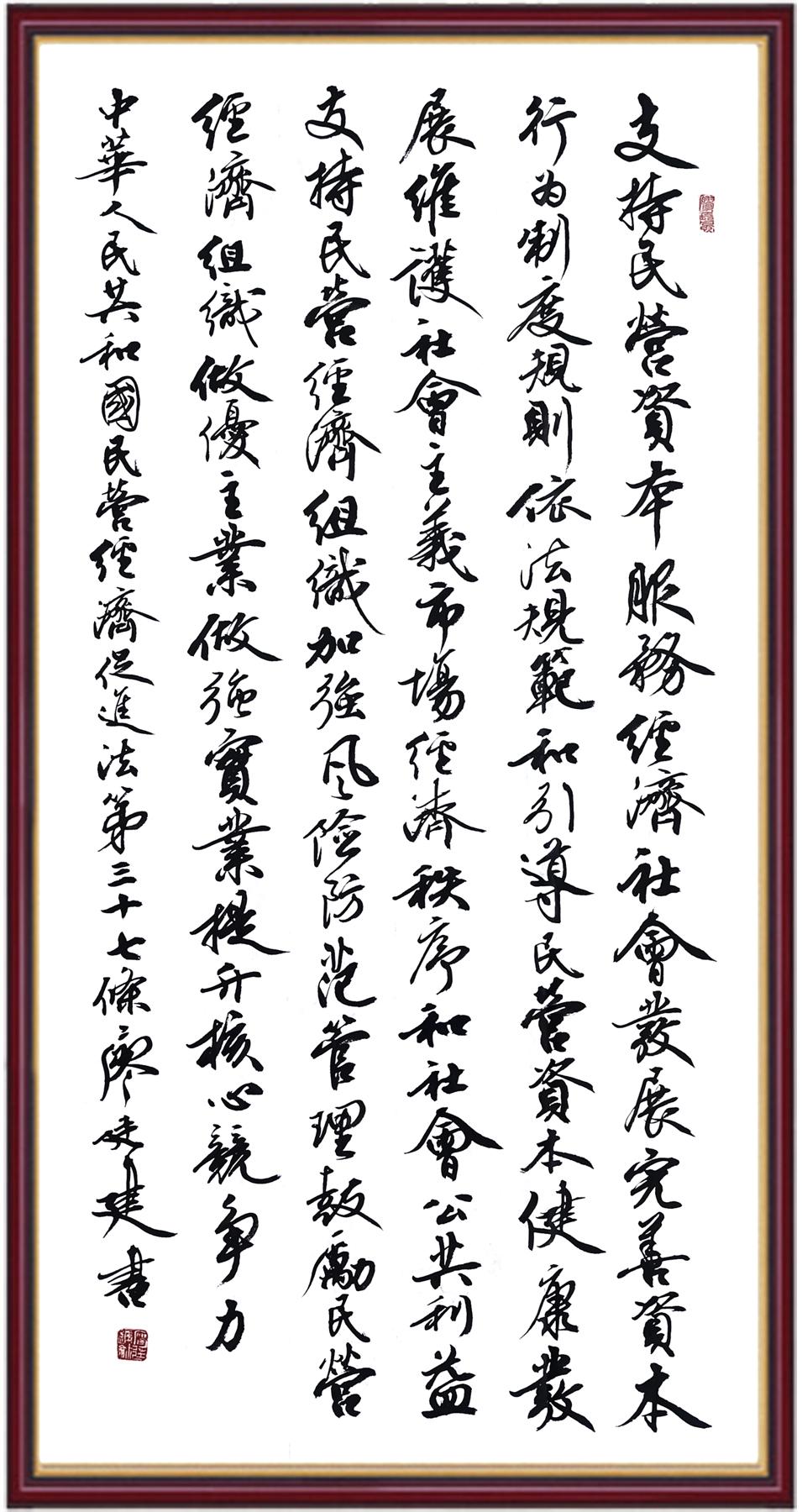 《中華人民共和國民營經(jīng)濟促進法》自今年5月20日起施行。作為我國首部專門關(guān)于民營經(jīng)濟發(fā)展的基礎(chǔ)性法律,民營經(jīng)濟促進法將支持和保障民營經(jīng)濟發(fā)展的法律制度融入中國特色社會主義法律體系,具有重大的法治意義,為促進民營經(jīng)濟持續(xù)、健康、高質(zhì)量發(fā)展提供了堅實的法治保障。為更好地學(xué)習(xí)、宣傳、貫徹這部法律,法治日報社聯(lián)合司法部普法與依法治理局,開展“‘書·法’系列活動之書寫《中華人民共和國民營經(jīng)濟促進法》”活動。