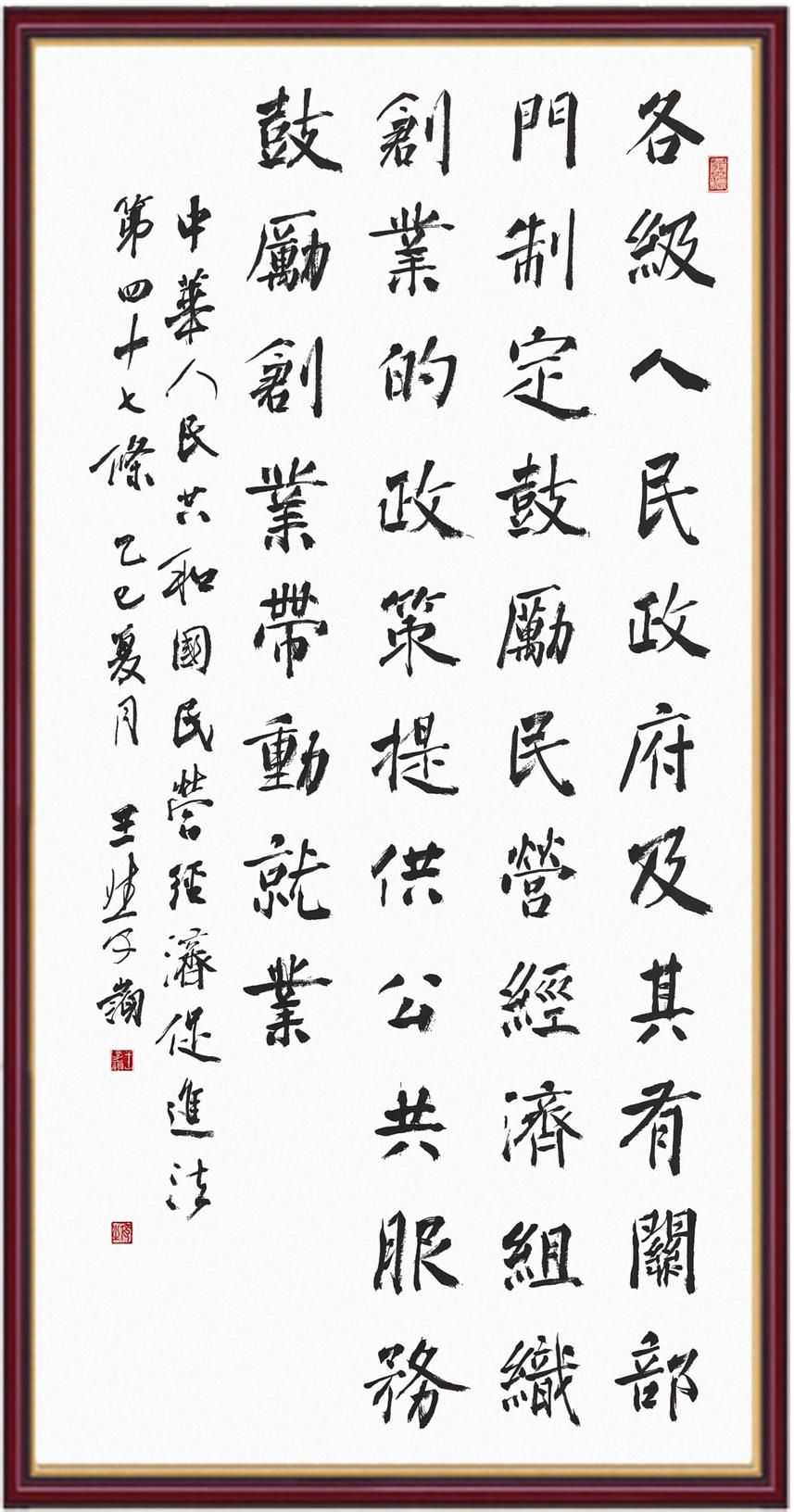 《中華人民共和國民營經(jīng)濟(jì)促進(jìn)法》自今年5月20日起施行。作為我國首部專門關(guān)于民營經(jīng)濟(jì)發(fā)展的基礎(chǔ)性法律,民營經(jīng)濟(jì)促進(jìn)法將支持和保障民營經(jīng)濟(jì)發(fā)展的法律制度融入中國特色社會(huì)主義法律體系,具有重大的法治意義,為促進(jìn)民營經(jīng)濟(jì)持續(xù)、健康、高質(zhì)量發(fā)展提供了堅(jiān)實(shí)的法治保障。為更好地學(xué)習(xí)、宣傳、貫徹這部法律,法治日報(bào)社聯(lián)合司法部普法與依法治理局,開展“‘書·法’系列活動(dòng)之書寫《中華人民共和國民營經(jīng)濟(jì)促進(jìn)法》”活動(dòng)。