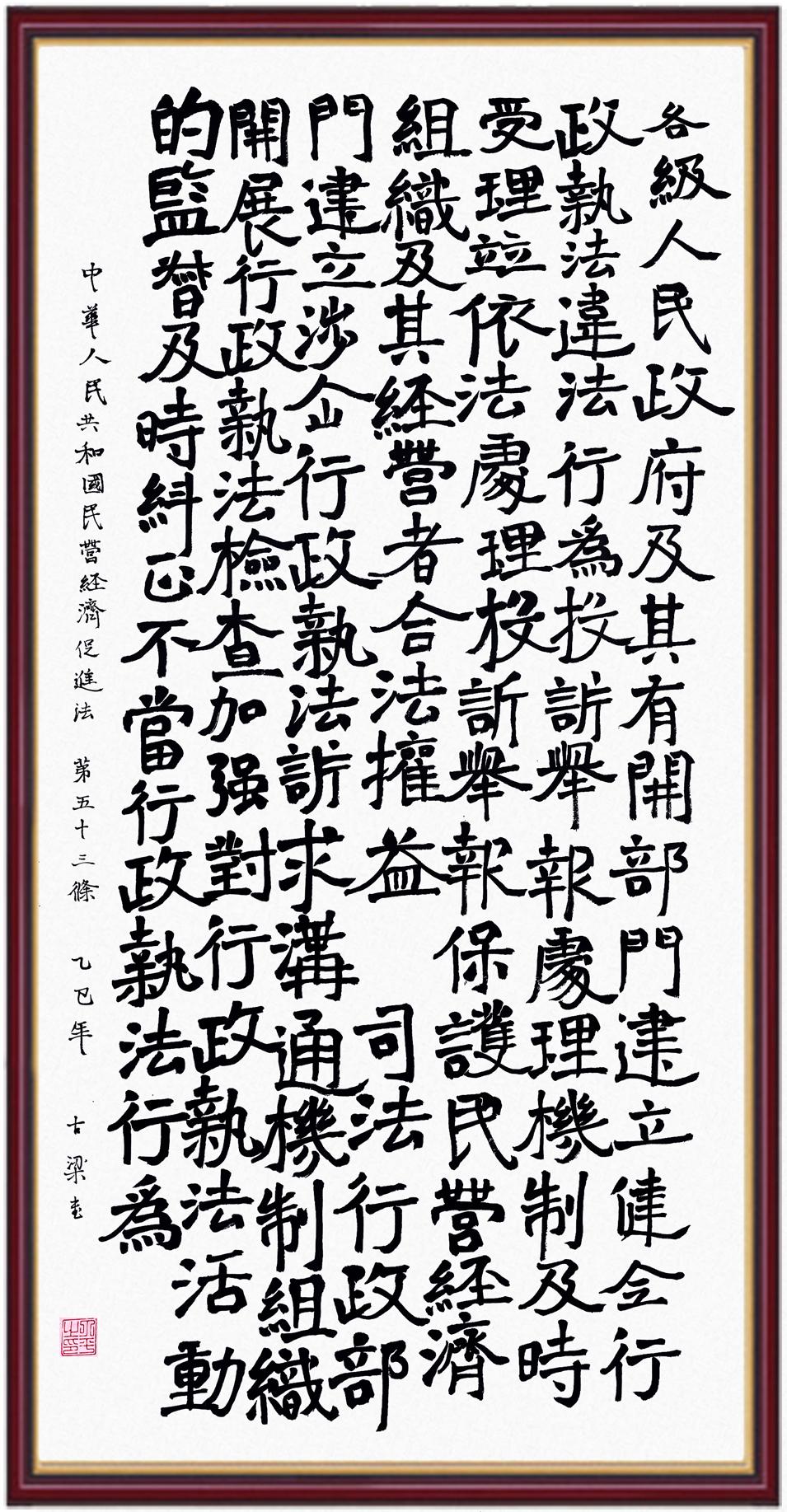 《中華人民共和國民營經(jīng)濟促進法》自今年5月20日起施行。作為我國首部專門關(guān)于民營經(jīng)濟發(fā)展的基礎(chǔ)性法律,民營經(jīng)濟促進法將支持和保障民營經(jīng)濟發(fā)展的法律制度融入中國特色社會主義法律體系,具有重大的法治意義,為促進民營經(jīng)濟持續(xù)、健康、高質(zhì)量發(fā)展提供了堅實的法治保障。為更好地學(xué)習(xí)、宣傳、貫徹這部法律,法治日報社聯(lián)合司法部普法與依法治理局,開展“‘書·法’系列活動之書寫《中華人民共和國民營經(jīng)濟促進法》”活動。