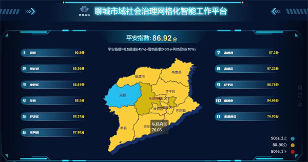 試點工作中,聊城市運用市域社會治理智能化平臺助力深化平安建設,在平臺定期生成全市“平安指數(shù)”,涵蓋各縣區(qū)社會治安、道路交通、安全生產(chǎn)等10項指標,引導精準查找、整改短板問題。針對重大活動,發(fā)揮平臺研判決策、指揮調(diào)度功能,對問題及時發(fā)現(xiàn)處置,助力工作嚴格落實。