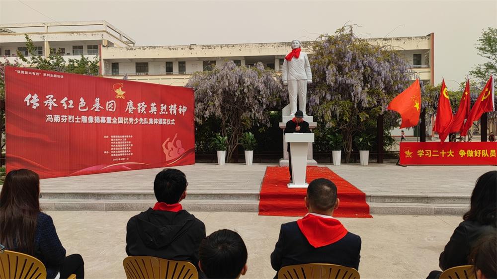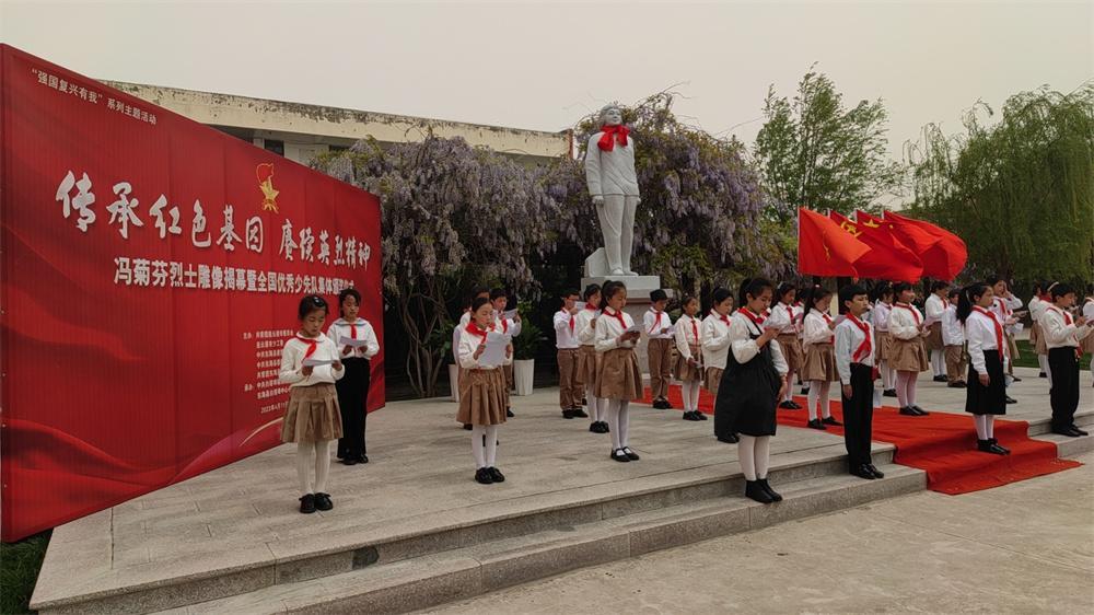 活動現(xiàn)場,出席儀式的幾位領(lǐng)導(dǎo)和少先隊(duì)員代表緩緩地為“雨花英烈”之一的馮菊芬烈士塑像揭幕,褪去紅布的烈士塑像在藍(lán)天白云下愈顯純潔高大、莊嚴(yán)而肅穆。