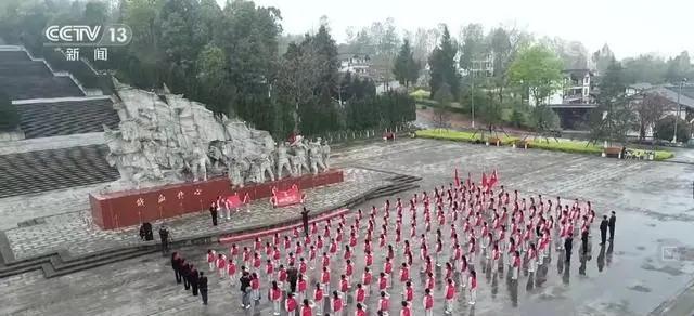 在川陜革命根據(jù)地紅軍烈士陵園,少先隊員們?yōu)闊o名烈士敬獻紅領(lǐng)巾,并用為無名墓碑上的紅星描紅補色的方式,寄托對革命先烈的哀思。