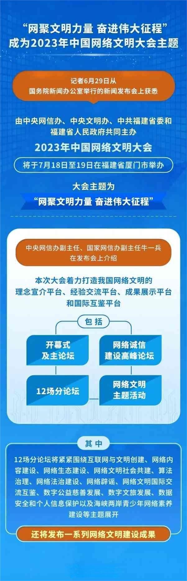 記者6月29日從國務(wù)院新聞辦公室舉行的新聞發(fā)布會上獲悉,由中央網(wǎng)信辦、中央文明辦、中共福建省委和福建省人民政府共同主辦,2023年中國網(wǎng)絡(luò)文明大會將于7月18日至19日在福建省廈門市舉辦,大會主題為“網(wǎng)聚文明力量 奮進偉大征程”。