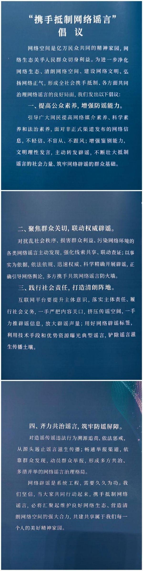 網(wǎng)絡(luò)空間是億萬(wàn)民眾共同的精神家園,網(wǎng)絡(luò)生態(tài)關(guān)乎人民群眾切身利益。為進(jìn)一步凈化網(wǎng)絡(luò)生態(tài)、清朗網(wǎng)絡(luò)空間、建設(shè)網(wǎng)絡(luò)文明、弘揚(yáng)網(wǎng)絡(luò)正氣,形成全社會(huì)攜手抵制、各方面共同治理網(wǎng)絡(luò)謠言的良好局面,本次論壇發(fā)布了《“攜手抵制網(wǎng)絡(luò)謠言”倡議》。