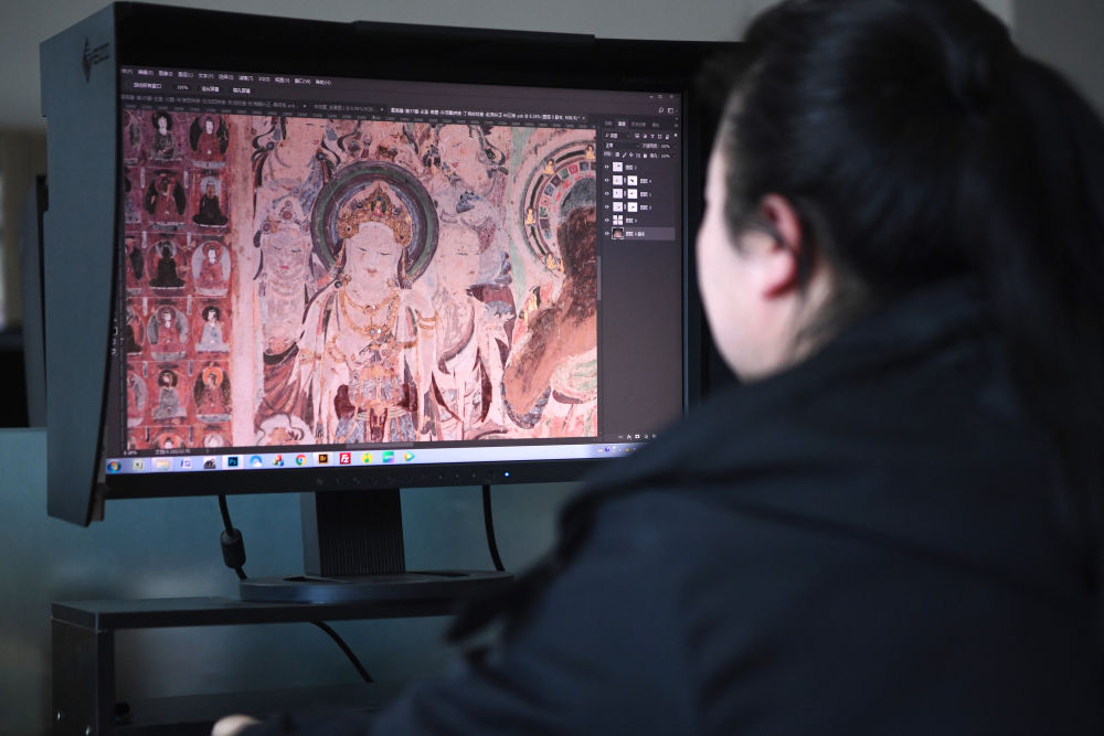 敦煌研究院文物數(shù)字化保護團隊圖像處理人員年海麗在拼接壁畫圖像(2023年4月25日攝)。數(shù)字化探索為莫高窟的保護與傳承開辟了全新路徑,數(shù)字技術讓敦煌文物走出洞窟,跨出國門,走向“永久保存、永續(xù)利用”。新華社記者 陳斌 攝