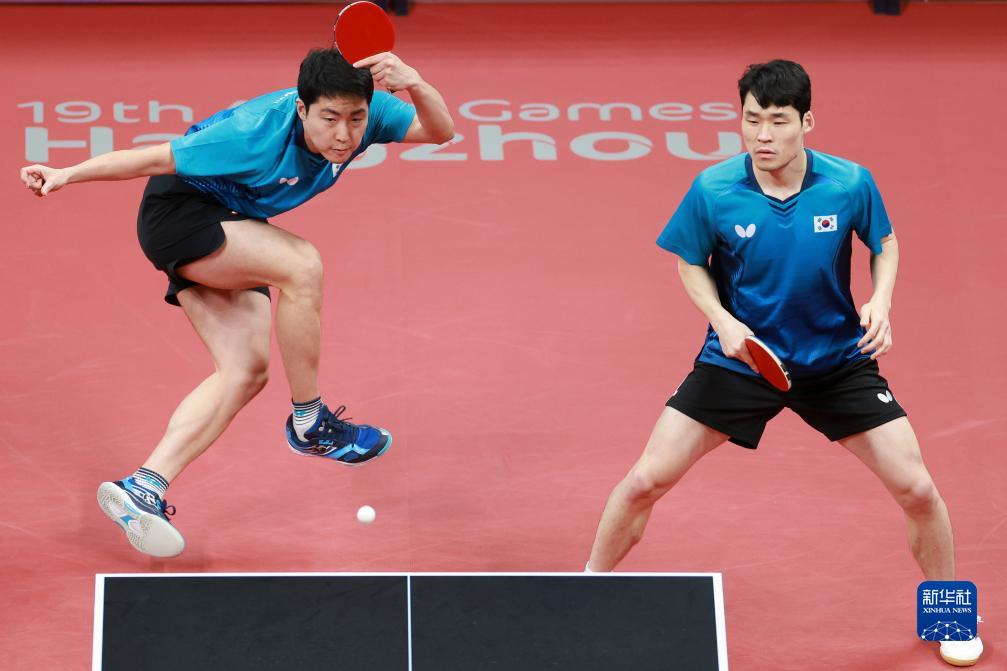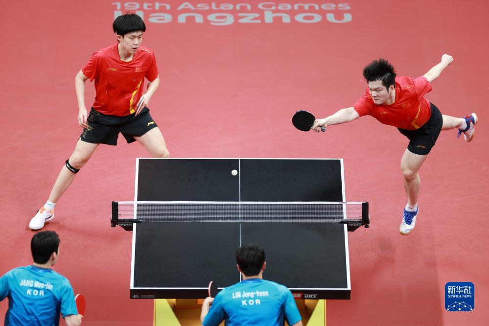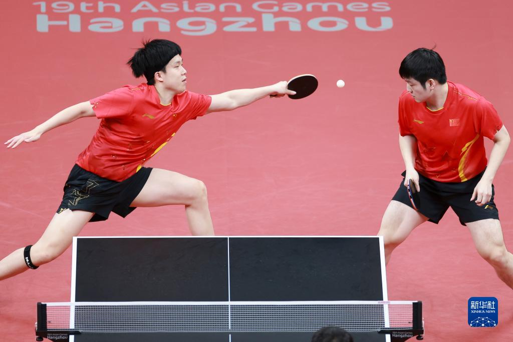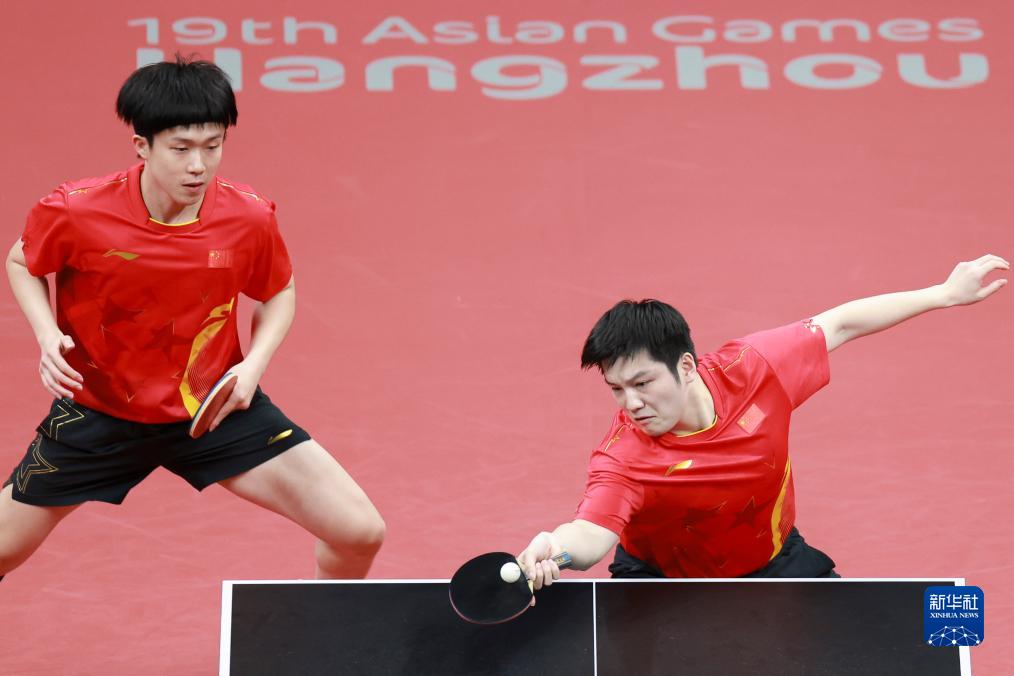 當(dāng)日,在杭州亞運(yùn)會(huì)乒乓球項(xiàng)目男子雙打決賽中,中國(guó)組合樊振東/王楚欽以4比0戰(zhàn)勝韓國(guó)組合張禹珍/林鐘勛,獲得冠軍。