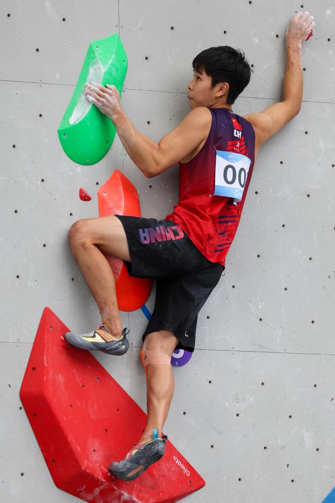 個(gè)人兩項(xiàng)全能賽包含攀石賽和難度賽,兩項(xiàng)比賽各占100分。當(dāng)天上午首先進(jìn)行攀石賽,每位運(yùn)動(dòng)員要攀爬4條線路,每條線路有5分鐘的攀爬時(shí)間,“完攀”線路數(shù)量越多且嘗試次數(shù)越少,排名越靠前。中國(guó)選手潘愚非在男子攀石賽中發(fā)揮出色,獲得100分并列第一。