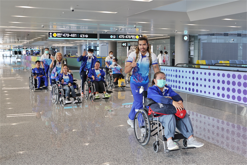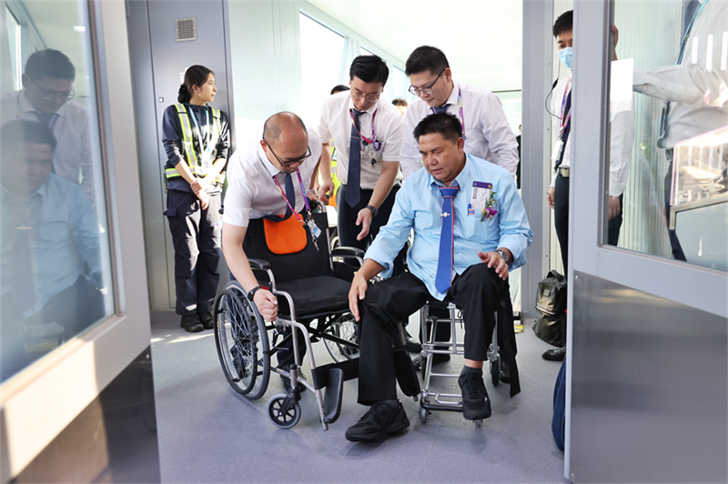 “一共219名代表團成員,其中78名輪椅旅客,下客艙后的轉換輪椅均已準備到位。”14時50分,泰國代表團成員搭乘TG8062包機航班落地,工作人員早已提前備好轉換輪椅在艙門口等候。