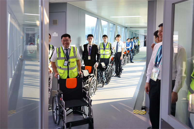 落地前,杭州蕭山國際機場聯(lián)合指揮中心就根據(jù)航班輪椅旅客數(shù)量、廊橋輪椅轉換空間等情況,合理安排停靠機位,同時對無障礙電梯進行專人管控。出艙后,工作人員開啟備用電梯,分流輪椅旅客,在進港各點位安排專人引導與協(xié)助,避免電梯口長時間等待滯留,提升代表團到達效率一倍以上。