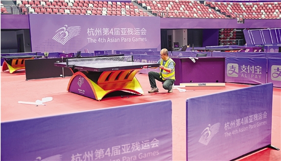 杭州拱墅運河體育公園體育館是杭州亞殘運會乒乓球項目的比賽及訓(xùn)練場館,目前場館轉(zhuǎn)換工作已基本就位。記者 董旭明 攝