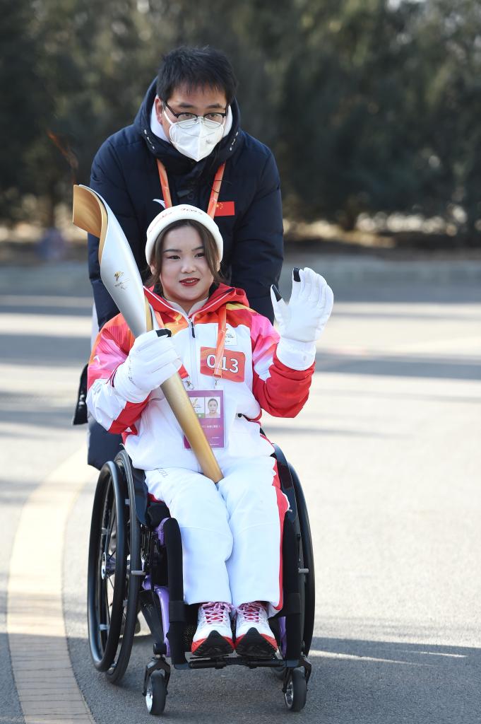 2023年3月2日,北京2022年冬殘奧會火種采集儀式在張家口市橋東“創(chuàng)壩”園區(qū)舉行,采集“‘氫’潔之火”。郭玲玲作為火炬手在傳遞火炬。新華社記者駱學(xué)峰攝
