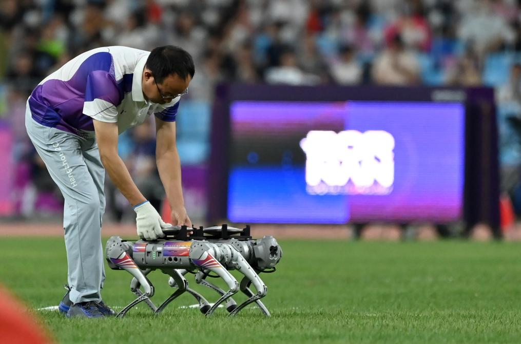 10月1日,在杭州亞運(yùn)會(huì)田徑女子鐵餅決賽前,一名工作人員將鐵餅放在用來搬運(yùn)鐵餅的機(jī)器狗上。新華社記者江漢攝