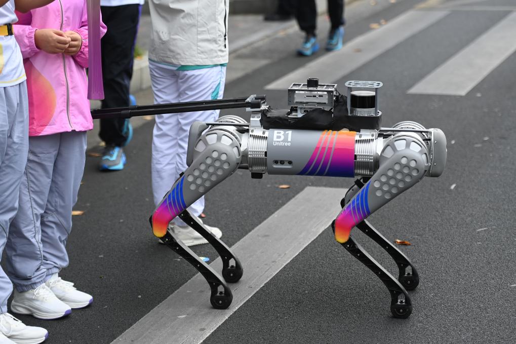 10月19日,火炬手蔡瓊卉在智能導(dǎo)盲犬的引導(dǎo)下進(jìn)行火炬?zhèn)鬟f。這是智能導(dǎo)盲犬首次在大型賽事火炬?zhèn)鬟f中亮相,它以四足智能機(jī)器人視覺識(shí)別能力引導(dǎo)視障殘疾人行走。新華社記者黃宗治攝