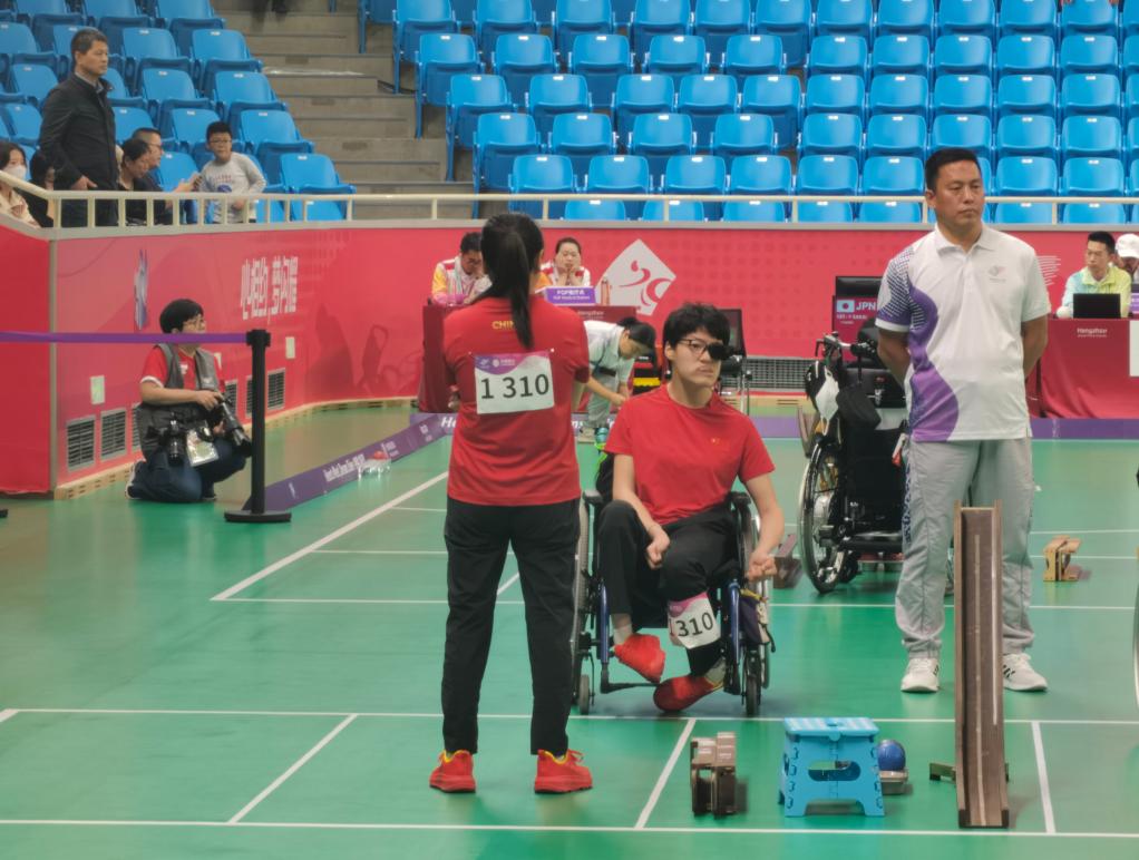 硬地滾球是最具包容性的殘疾人運動之一,專門為腦癱患者、嚴(yán)重軀體功能障礙的運動員而設(shè)立。其根據(jù)運動員殘疾程度分為4個級別,楊貝貝屬于其中較重的級別,無法獨立擲球,因此需要軌道器械和競賽輔助人員的幫助。