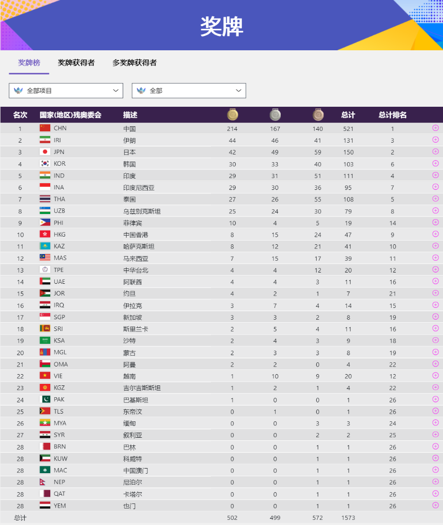 新華社杭州10月28日電(記者馬思嘉)杭州亞殘運會在28日迎來最后一個比賽日,當(dāng)天共決出46枚金牌,中國隊收獲其中的18枚,金牌總數(shù)達到214枚,高居榜首。伊朗隊和日本隊分別以44金和42金位列第二、第三。