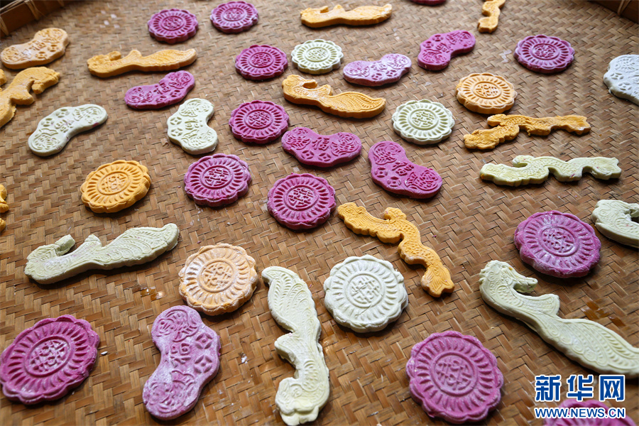 1月18日,在安徽省黃山市徽州區(qū)潛口鎮(zhèn)潛口村,村民用模具制作的多彩徽州米粿。