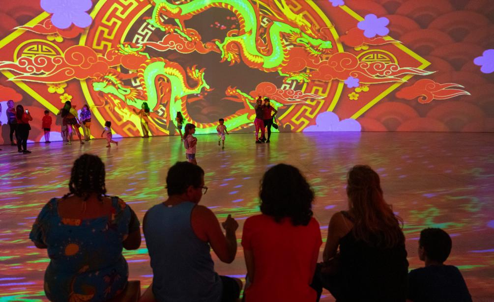 夜幕降臨,燈光秀上演。公園內(nèi)的路易斯門東薩劇院外墻上騰起金色巨龍的燈光秀,龍年拜年娃娃、二十四節(jié)氣隨后展現(xiàn),之后在劇院的舞臺上來自圣保羅唐韻藝術(shù)團的演員們帶來中國特色舞蹈。
