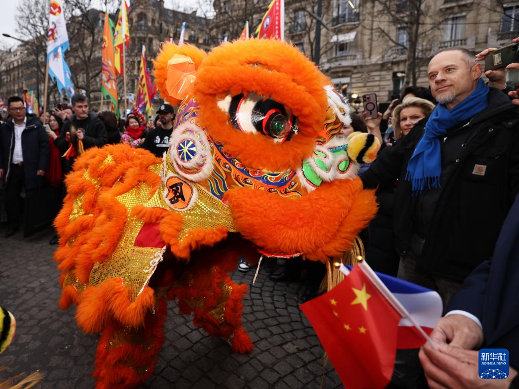法國華人社區(qū)4日在巴黎香榭麗舍大街主辦舞龍舞獅等表演活動,慶祝即將到來的龍年春節(jié)。