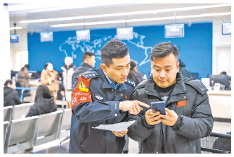 圖為民警現(xiàn)場(chǎng)指導(dǎo)群眾通過(guò)“西安出入境”微信公眾號(hào)辦理相關(guān)業(yè)務(wù)。