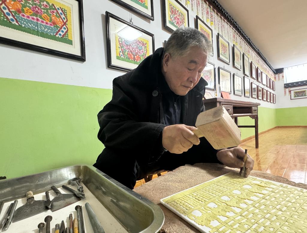 74歲的劉勝余拿著紙銼刀和小木槌,在一摞宣紙上依次鑿打出鏤空的花朵、銅錢和吉祥話語。兒子劉斌戴著指套,用細(xì)桿毛筆為形狀各異的宣紙逐層染上顏色……屋里滿是叮當(dāng)敲打和罐罐茶在爐火上滾沸的咕嚕聲。