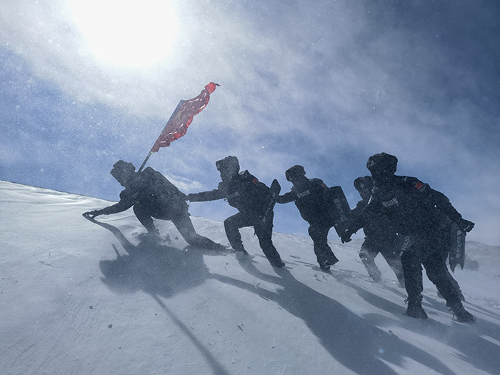 海拔越來越高,山脊坡度越來越陡。民警們開始手腳并用埋頭攀爬,越往上爬,積雪越厚,空氣越稀薄,大家紛紛大張著嘴,不斷鼓起腮幫子,希望能多吸進一些氧氣。