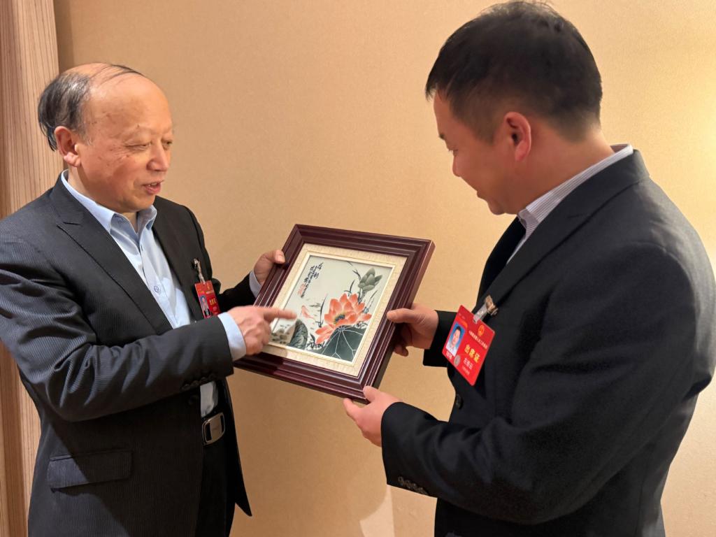 3月3日,全國人大代表、景德鎮(zhèn)陶瓷發(fā)展中心主任于集華(左)向參會(huì)代表講述景德鎮(zhèn)陶瓷文化。新華社記者 賴星 攝