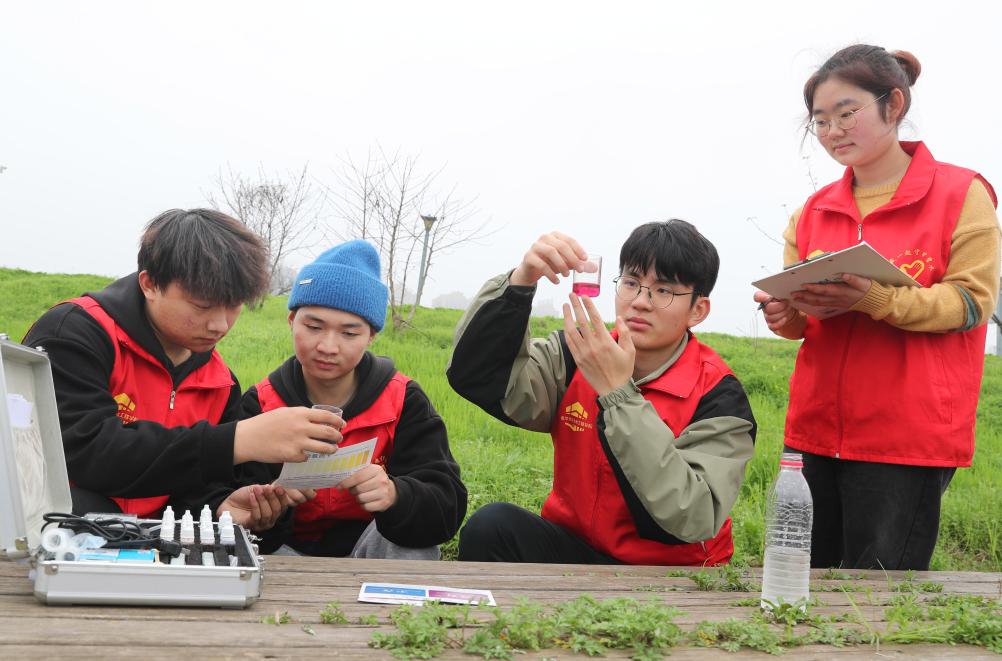 2024年3月17日,湖南省衡陽(yáng)市雁峰區(qū)東洲島上,南華大學(xué)土木工程學(xué)院志愿者們?cè)跈z測(cè)湘江水質(zhì)。新華社發(fā)(曹正平攝)