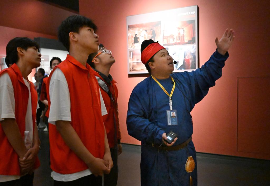 2024年4月26日,河南博物院志愿者劉焱(右一)為高校志愿者講解。新華社記者 李嘉南 攝