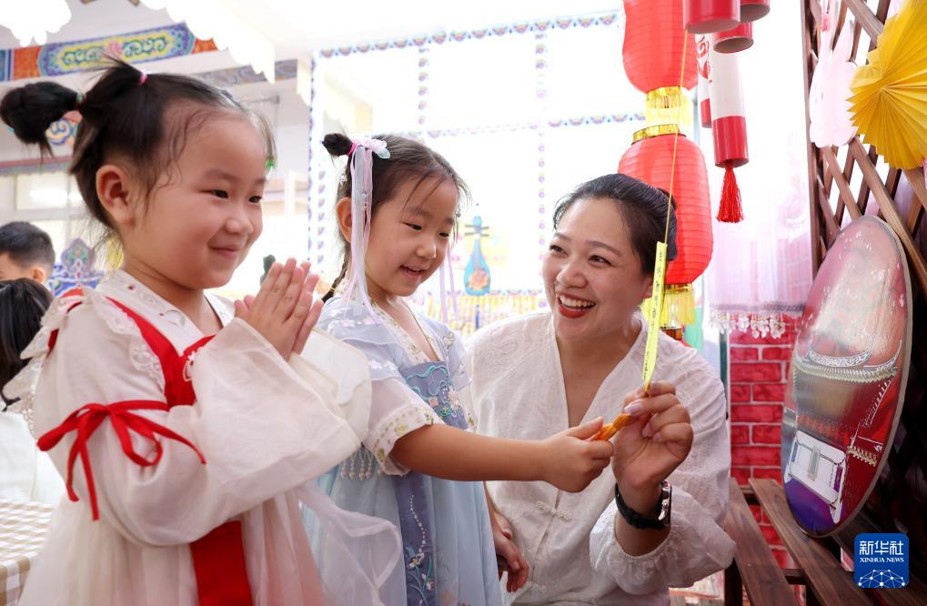 9月4日,在河北省石家莊市藁城區(qū)通安幼兒園,老師和小朋友進(jìn)行猜燈謎游戲。