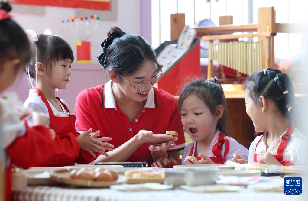 9月4日,在河北省石家莊市藁城區(qū)通安幼兒園,老師和小朋友一起制作手工月餅。