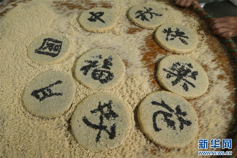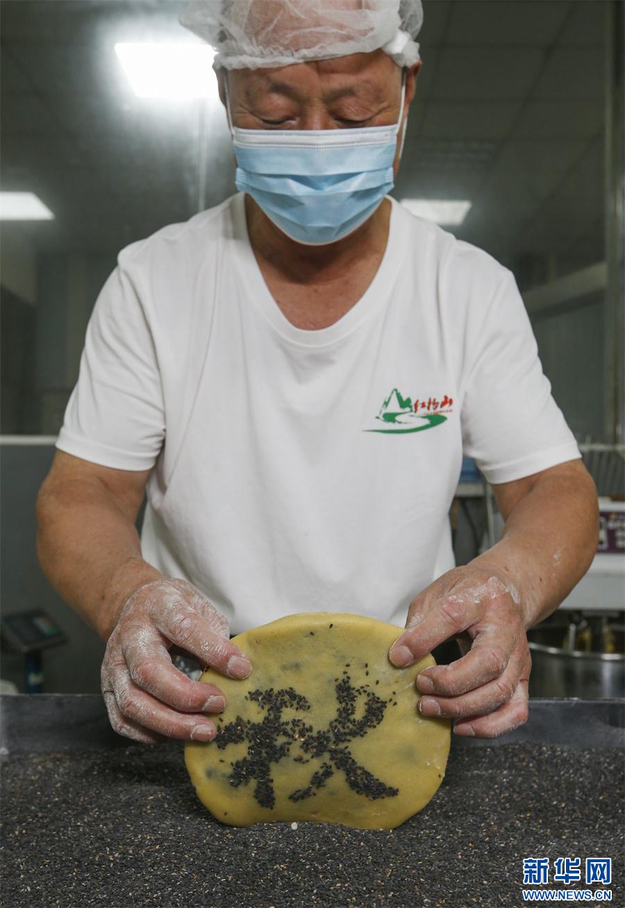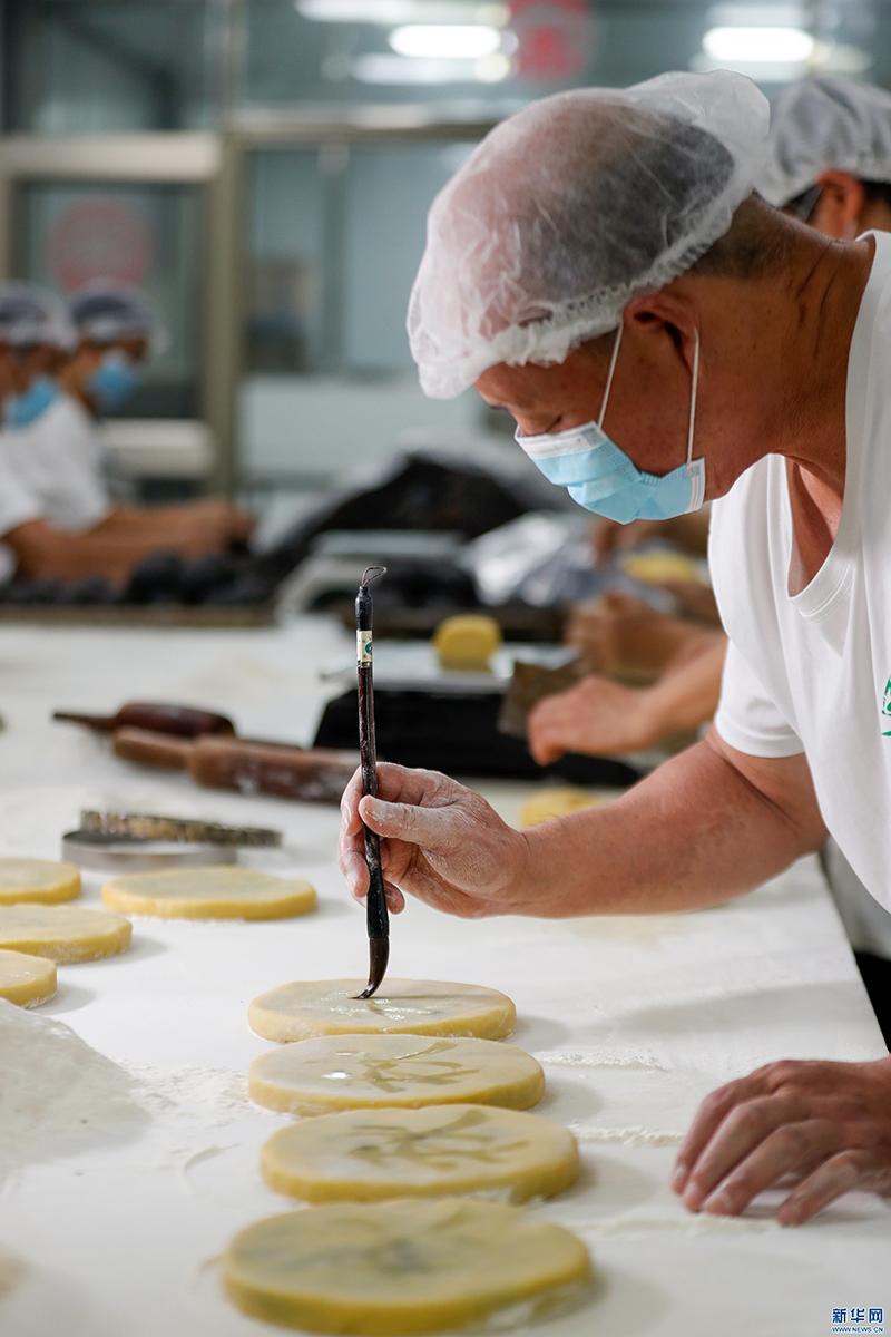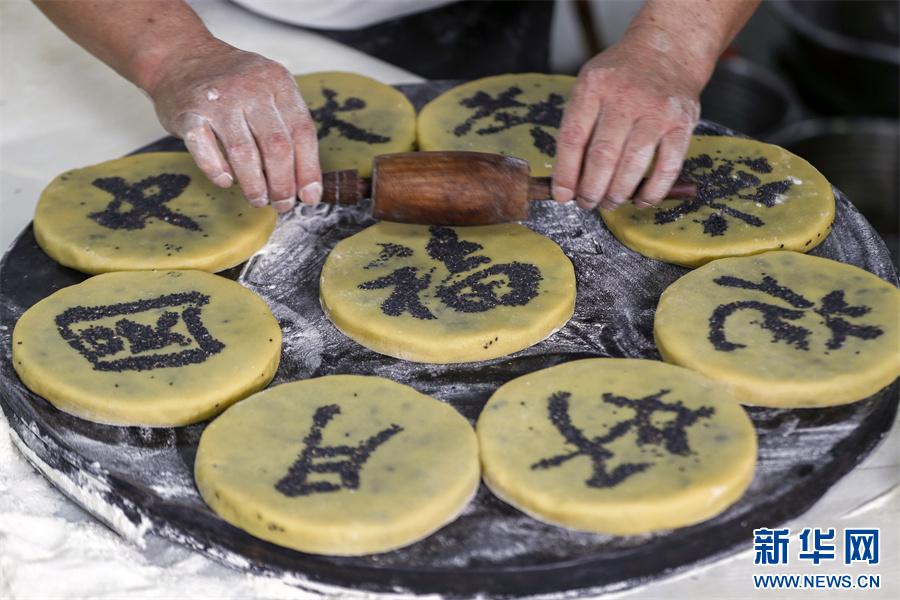 近日,制餅手藝人給月餅上的字沾上黑芝麻。