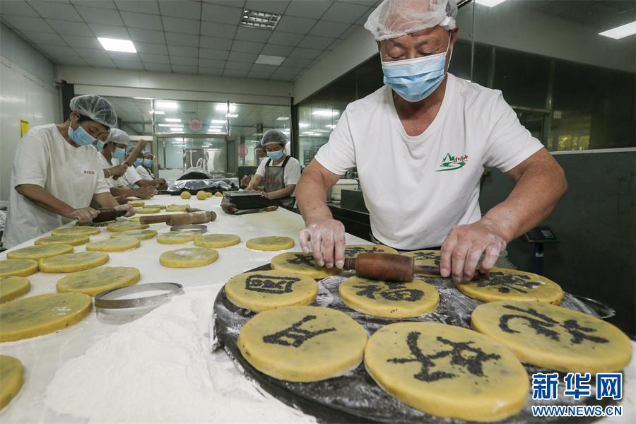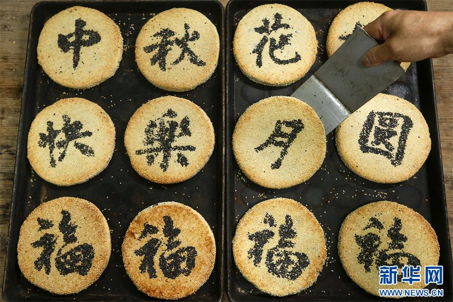 臨近中秋佳節(jié),在安徽省黃山市祁門(mén)縣,徽州制餅手藝人經(jīng)過(guò)“配料、打面皮、包餡、壓形、寫(xiě)字、粘黑芝麻、上白芝麻和烘烤”等古法工序后,制成可食可賞的“徽州月餅”,深受食客喜愛(ài)。