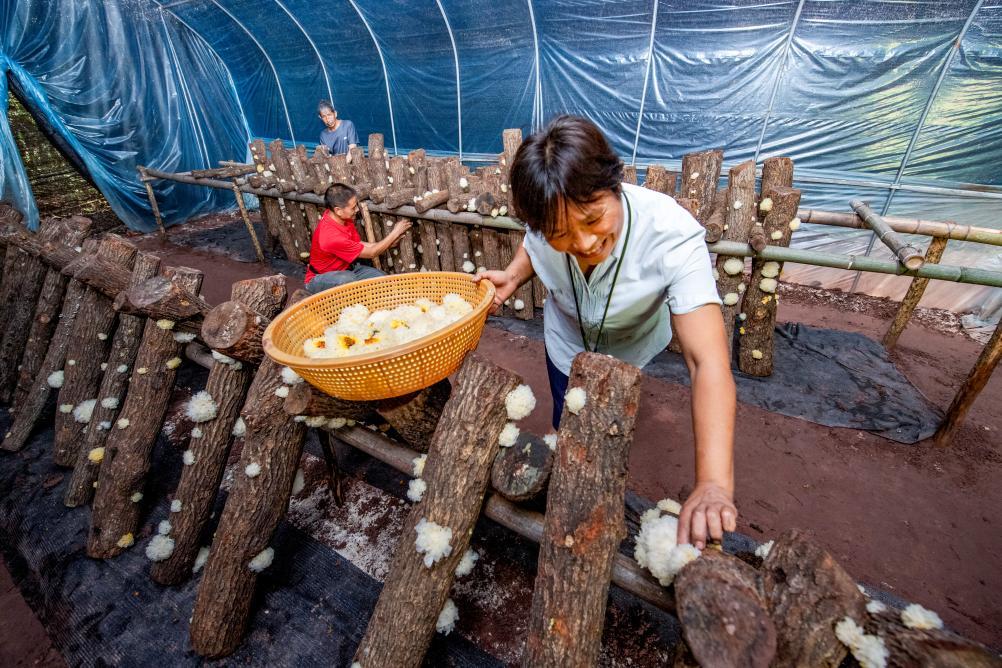 7月4日,巴中市通江縣陳河鎮(zhèn)河壩場村村民賈玉瓊一家在采摘自家種植的銀耳。新華社發(fā)(受訪單位供圖)