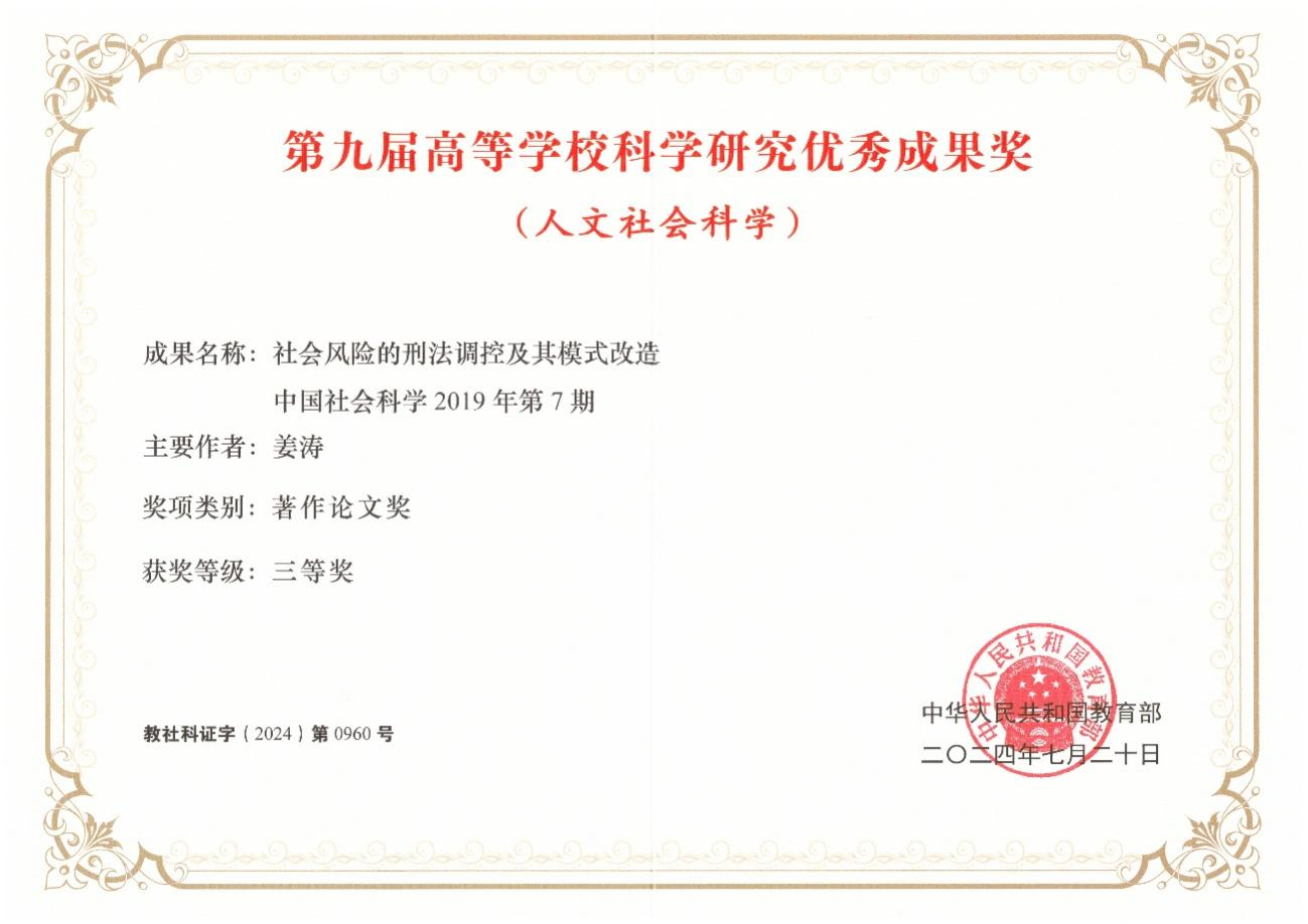 2024年7月,南京師范大學中國法治現(xiàn)代化研究院研究員姜濤的論文《社會風險的刑法調(diào)控及其模式改造》榮獲第九屆高等學??茖W研究優(yōu)秀成果獎(人文社會科學)三等獎。