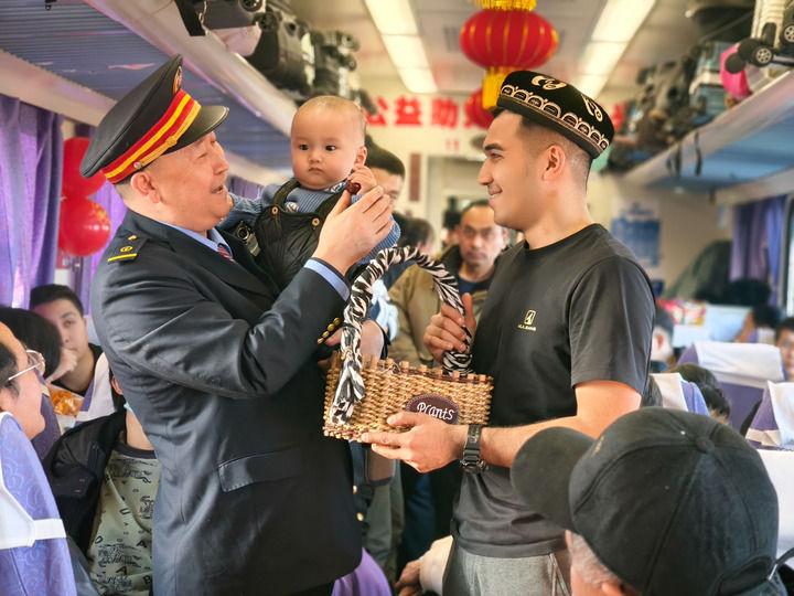 “列車巴扎開(kāi)市啦!”1月25日早9點(diǎn),祖國(guó)大西北,7558次“和田玉龍?zhí)枴绷熊囬_(kāi)出新疆和田站。沒(méi)多久,12號(hào)車廂里就傳來(lái)列車長(zhǎng)坡拉提汗的吆喝聲。車廂里立馬熱鬧起來(lái),售賣農(nóng)副產(chǎn)品的吆喝聲、旅客的笑聲和交談聲奏響了歡樂(lè)的旋律……