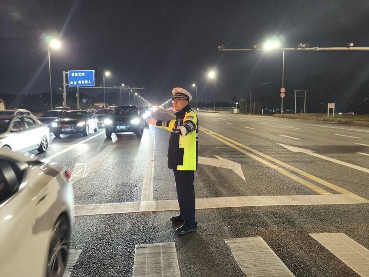 1月25日晚,張潔在樂(lè)山市蘇稽新區(qū)西岸路口指揮疏導(dǎo)交通。新華社發(fā)(劉冉攝)