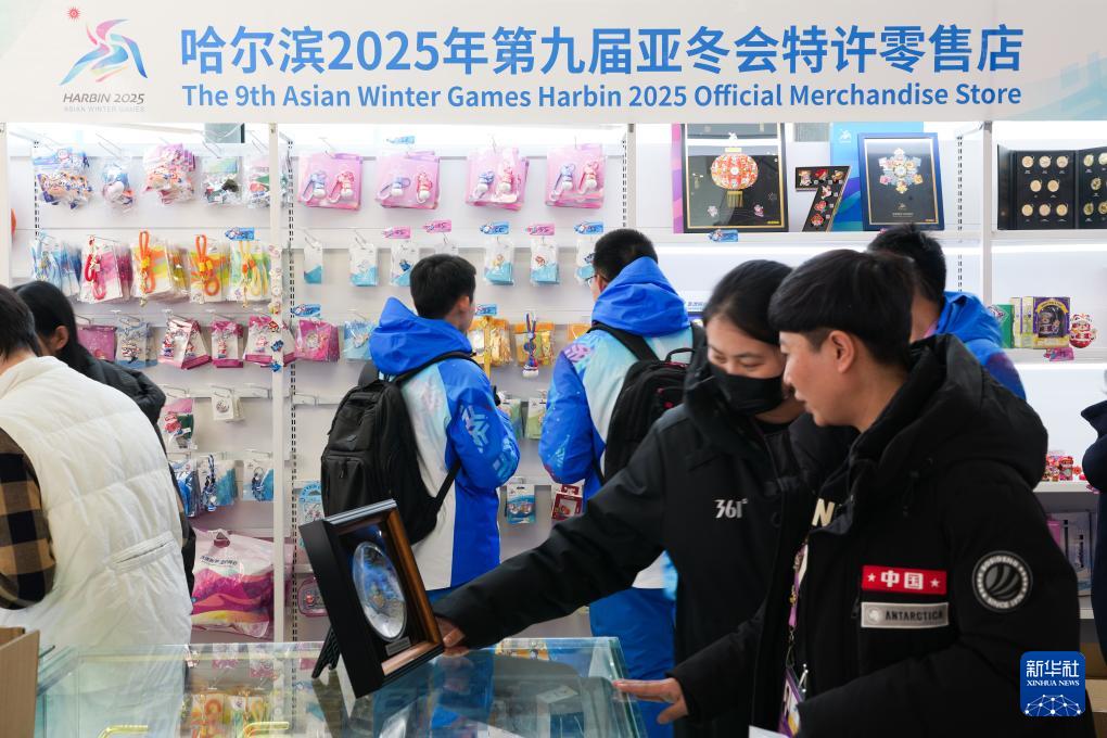 2月5日,人們在主新聞中心內(nèi)的亞冬會特許商品零售店選購紀念品。