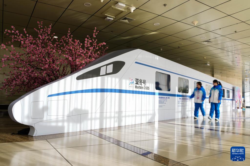 2月5日,志愿者經(jīng)過主新聞中心的一處亞冬會主題裝飾。