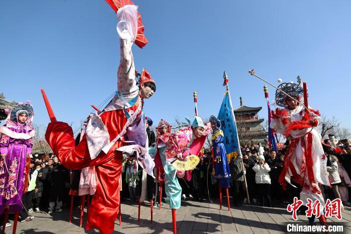 圖為2月9日,霸州市勝芳古鎮(zhèn)花會(huì)活動(dòng)現(xiàn)場(chǎng),同義高蹺老會(huì)帶來(lái)精彩表演。賈珺 攝