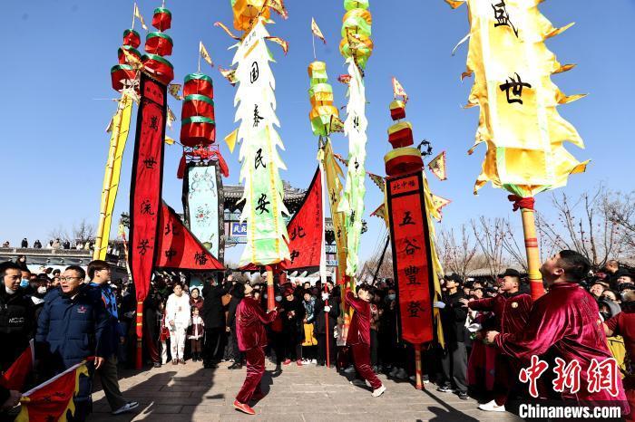 圖為2月9日,霸州市勝芳古鎮(zhèn)花會(huì)活動(dòng)現(xiàn)場(chǎng)中幡會(huì)表演。賈珺 攝