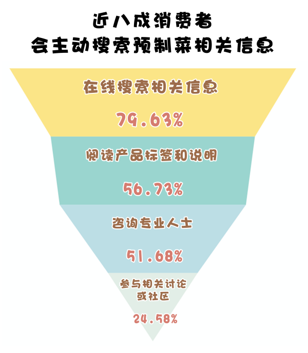 預(yù)制菜食品安全問題令受消費(fèi)者尤為關(guān)注。從艾媒咨詢發(fā)布的數(shù)據(jù)來看,近八成的消費(fèi)者會(huì)主動(dòng)搜索預(yù)制菜相關(guān)信息,超過五成的消費(fèi)者會(huì)通過閱讀產(chǎn)品標(biāo)簽和說明、咨詢專業(yè)人士來確保自己吃到的是安全健康的預(yù)制菜。