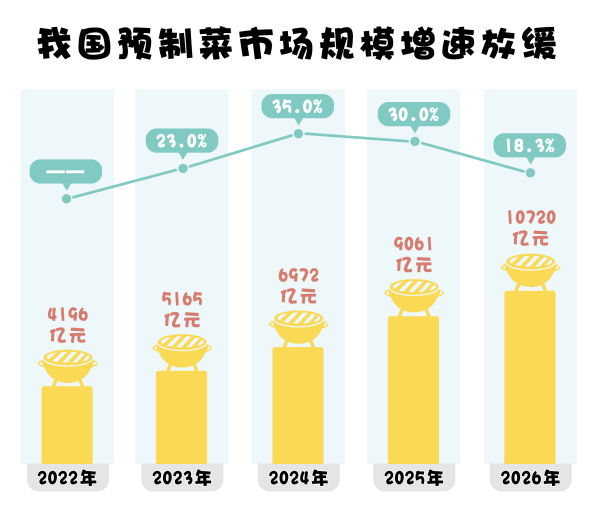 從艾媒咨詢發(fā)布的數(shù)據(jù)來看,我國預(yù)制菜市場(chǎng)規(guī)模呈逐年擴(kuò)張趨勢(shì),并有望在2026年突破10720億元,但是預(yù)制菜市場(chǎng)規(guī)模增速卻在逐步放緩。2024年,我國預(yù)制菜市場(chǎng)規(guī)模同比增長(zhǎng)率為35%,而這一數(shù)字預(yù)計(jì)在2026年跌至18.3%。
