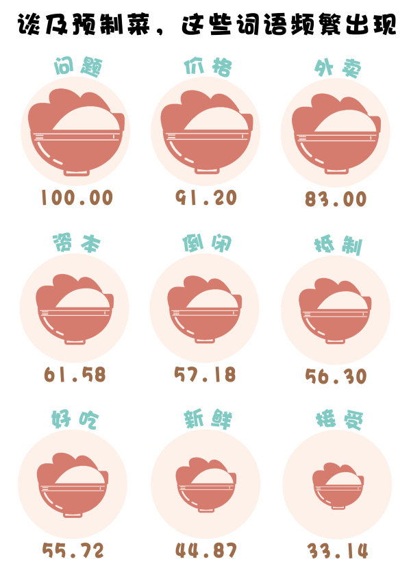 (數(shù)據(jù)來源:選取嗶哩嗶哩視頻《餐館倒閉300萬家,預(yù)制菜祭天,集體退圈的商家,人民的勝利》下的3950條一級(jí)評(píng)論及彈幕,做分詞及歸一化處理,進(jìn)行分詞后將熱度最高的詞語規(guī)定為100)