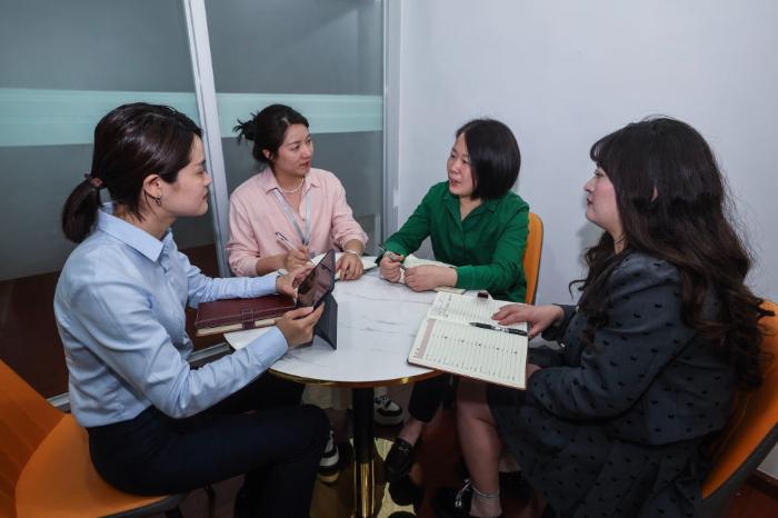 2025年4月17日,在浙江星程吉月智能科技有限公司,浙江杭州市富陽(yáng)經(jīng)濟(jì)技術(shù)開(kāi)發(fā)區(qū)助企服務(wù)專(zhuān)員(左二)、富陽(yáng)農(nóng)商銀行工作人員(左一)上門(mén)解決企業(yè)融資需求。新華社記者 徐昱 攝